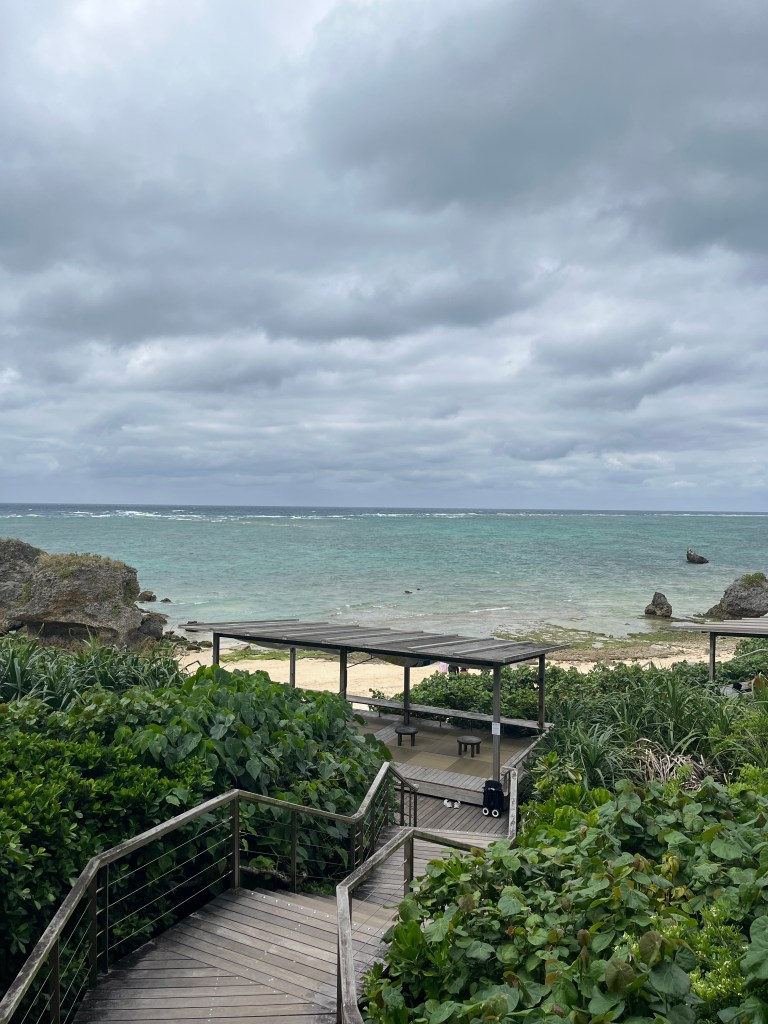 今天的風非常的大,點了簡單的午餐跟沖繩檸檬果汁之後,我本來想要去下面坐在海旁邊,不過下面的位置要脫鞋坐在塌塌米上面,對挪威先生來說太不舒服了,於是我們就待在上面的平台先把午餐吃完,再走到沙灘去散步。