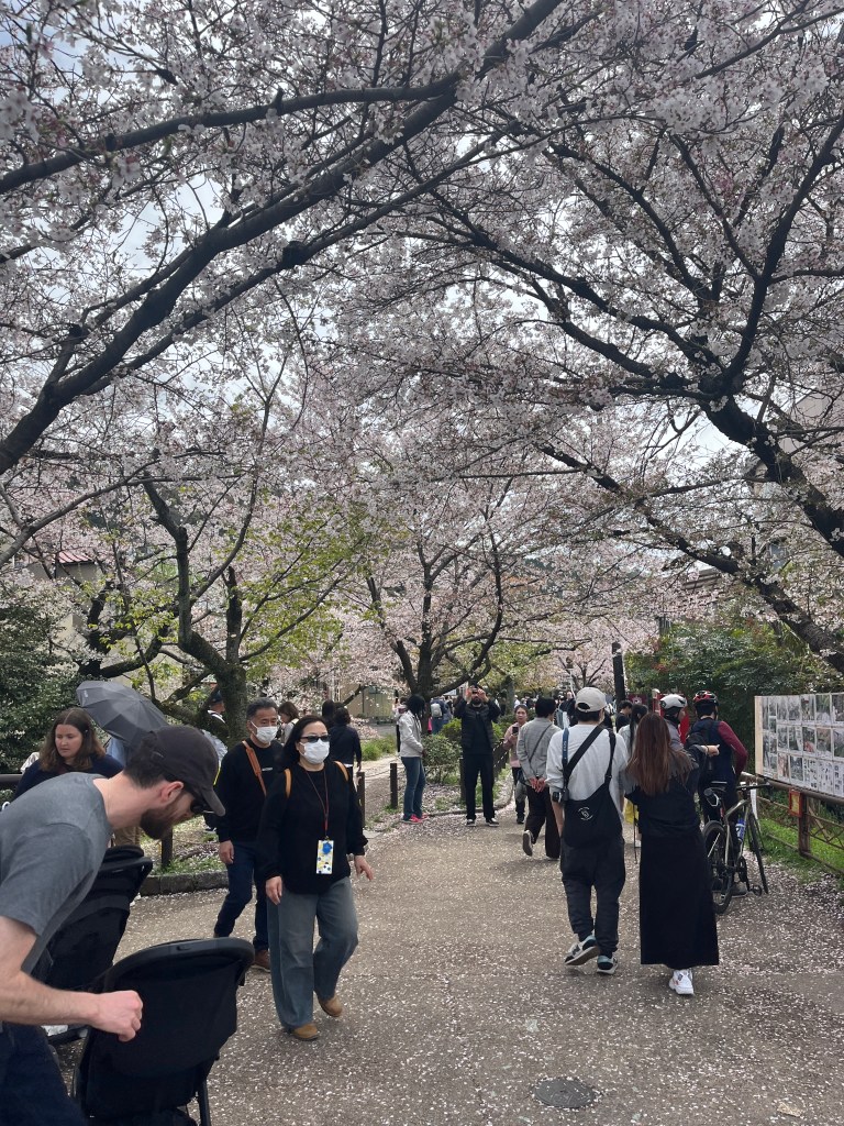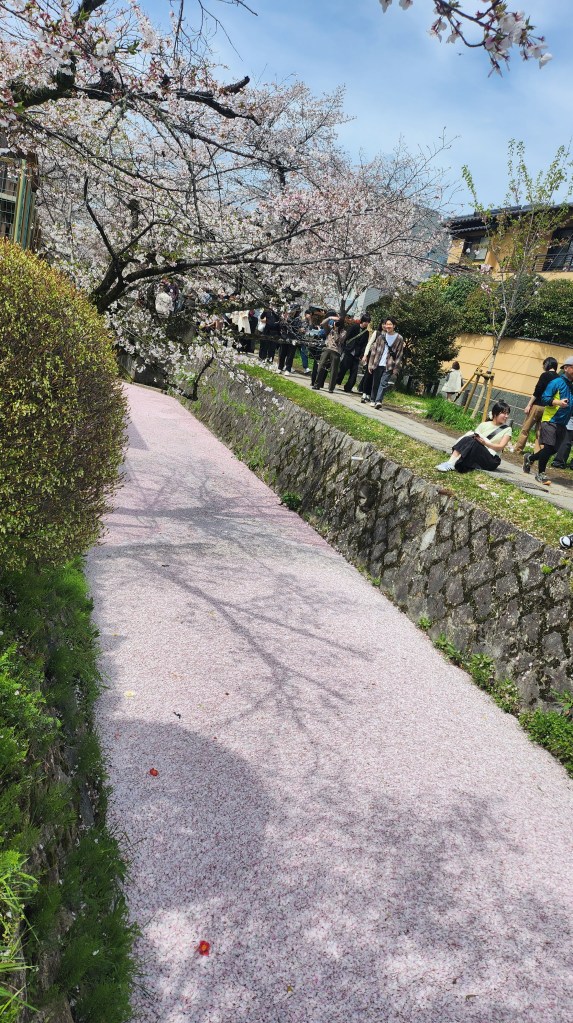 準備好之後就騎腳踏車出門了,好久沒有騎上腳踏車,覺得很舒服。往銀閣寺方向騎過去,路上其實到處都有櫻花,這個城市的櫻花密度真的很高。哲學之道非常的澎湃,人非常的多,花也很澎湃。入口的地方河流形成了花筏,櫻吹雪的花瓣都集中到這邊來了,粉紅色非常的美。