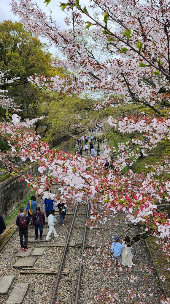 騎下去永觀堂南禪寺的路上人也蠻多的,三門那邊也有櫻花開,但我沒有想要停下來看,騎到蹴上鐵道,鐵道配著櫻花的確很美,上面也有很多人在散步,但我現在就已經覺得累了,可能感冒病毒還是發揮了他們的魔力吧。