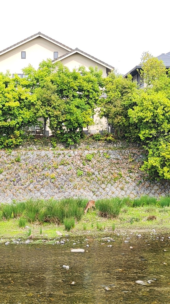 這一隻就大大方方地站著找草吃,沒有蹲低躲在草叢裡,還露出白色的屁股給我們看。鴨川是一個神奇的河流,這裡的生態系好完整,有各式各樣的水鳥,有水豚,還有水鹿。太令人喜歡了。