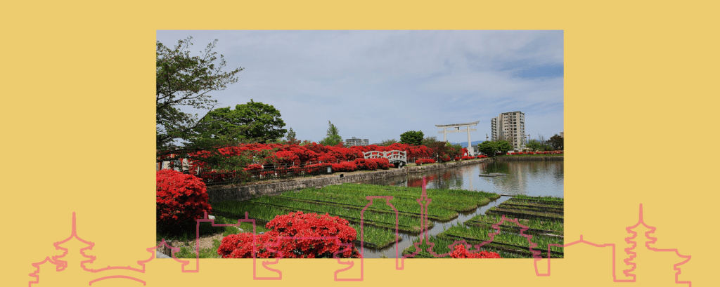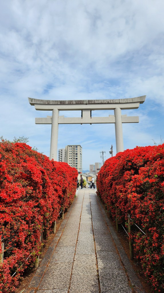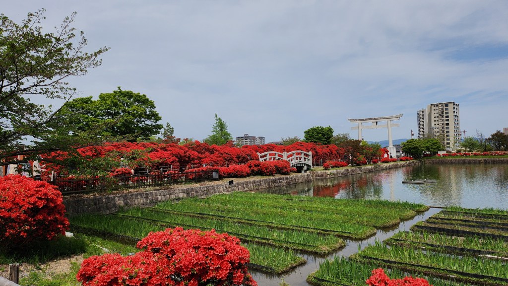 今天的第一個開車兜風地點是長岡天滿宮,朋友在網路上查到現在有杜鵑大盛開,照片看起來很澎湃,從京都市區開過去大概是三十到四十分鐘。