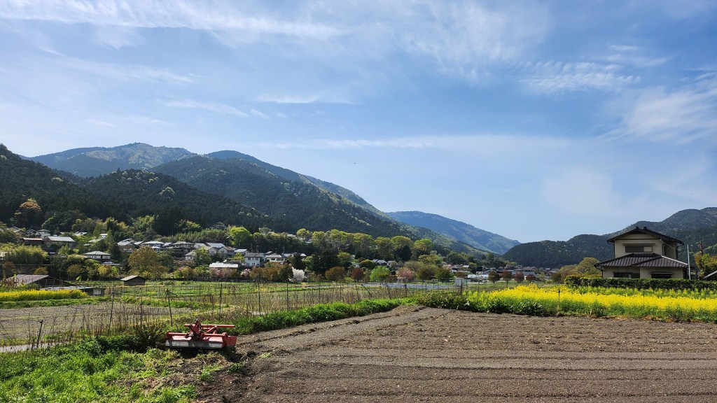寂光院最下面的停車場對面看起來就是一幅非常美的田園畫,遠方的山景、山腳下的農家、開滿油菜花的田,離市區不遠的地方竟然就有這種田園風景。