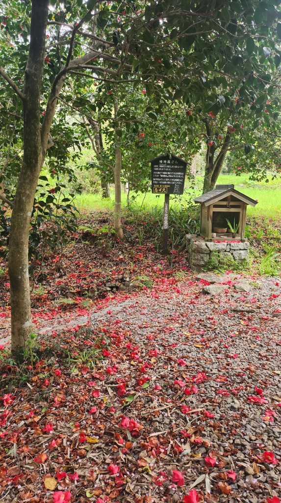 經過一座小橋,看見椿地藏的牌子,走進去一看,紅色的椿花落滿一地,階梯上好像撲了椿花的地毯一樣,怎麼會有這麼美的地方?再往裡面走有一個空地,木椅上面落滿了櫻花花瓣,坐在樹下吹風太舒服了,吹的我們都想躺下來休息了。