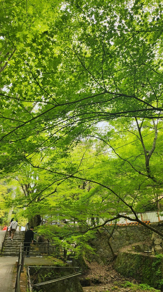 巧遇聊了一會天之後我們就繼續各自的行程。三千院的參道春天有新綠的美,沿路的楓樹都長出新葉子了,是非常鮮的綠色,跟秋天的感覺不一樣,但是一樣都很美。