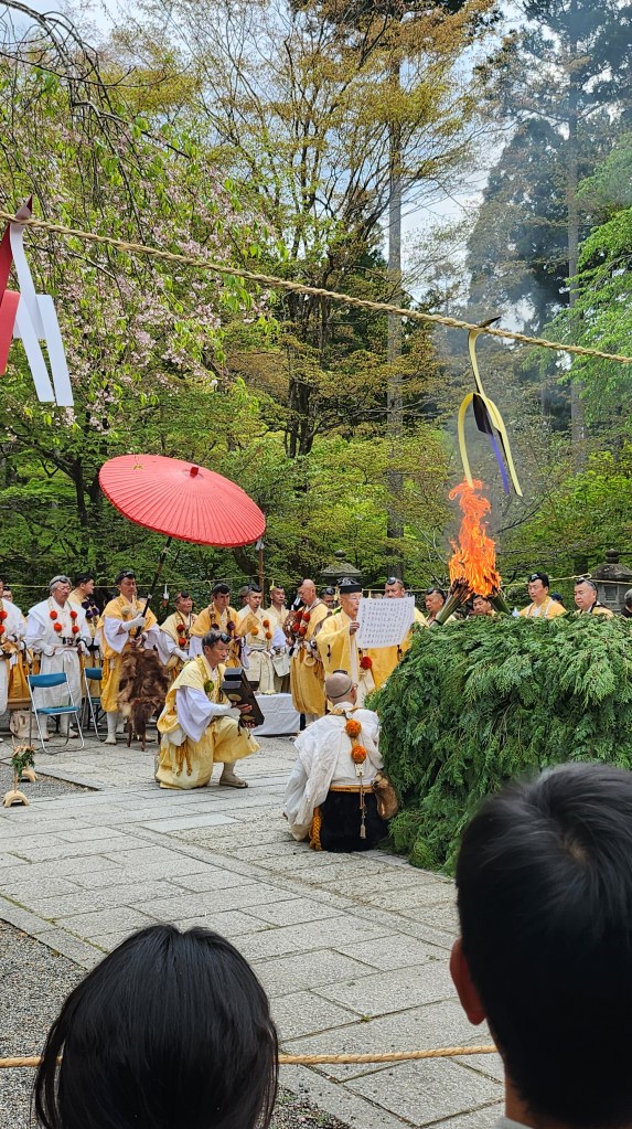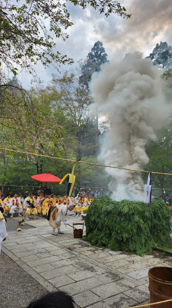 首先兩個人演了一個小短劇,其實根本聽不清楚他們在說什麼,不知道在場的日本人聽不聽得懂這種拉長聲音像是在朗誦什麼的日文。接著有人拿劍、有人拿斧頭、有人拿一個不知道是什麼的法器在四個方位都點了或是砍了一下,最後拿著大弓往五六個方位射出了箭,然後看起來像是主要的法師就上前唸了一段祈禱文,結束之後走出兩個人拿著長長的火把點了火,有點像是之前我看到的火祭,澎湃的黑煙就冒了出來,祭典就開始了。
