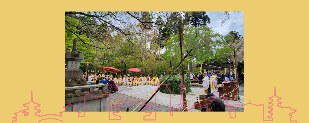 到了不動明王堂前面已經都排好祭祀跟推好了松木,這一看起來就是等一下要燒松樹堆跟護摩木來消災解厄。要做儀式的人都進去裡面做好位置,也拿好自己的法器了,周圍也都排好了木椅子讓大家可以坐下,這就是一點半要開始的儀式。