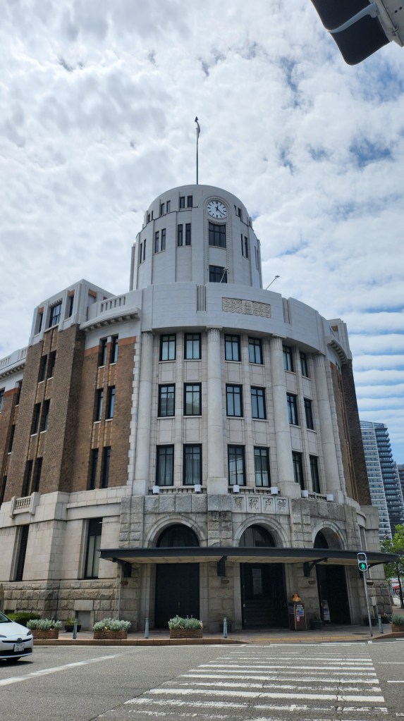 神戶稅關管的範圍很大,幾乎它的西邊都在管轄範圍裡面。大廳非常的氣派,建築很漂亮,庭院也有一個特殊的形狀,後來在資料館才知道是用船的意象去設計的大樓。資料館裡面有很多可以互動的東西,進來逛一下很不錯。