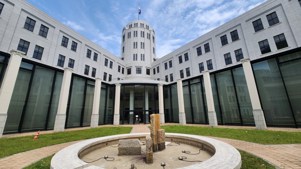 吃完之後繼續往海的方向走過去,走過一個公園之後,看到了稅關大樓。建築看起來很美,我們就走過去了,警衛要我們登記,登記之後就可以參觀對外開放的三個地方,大廳、庭院跟資料館。