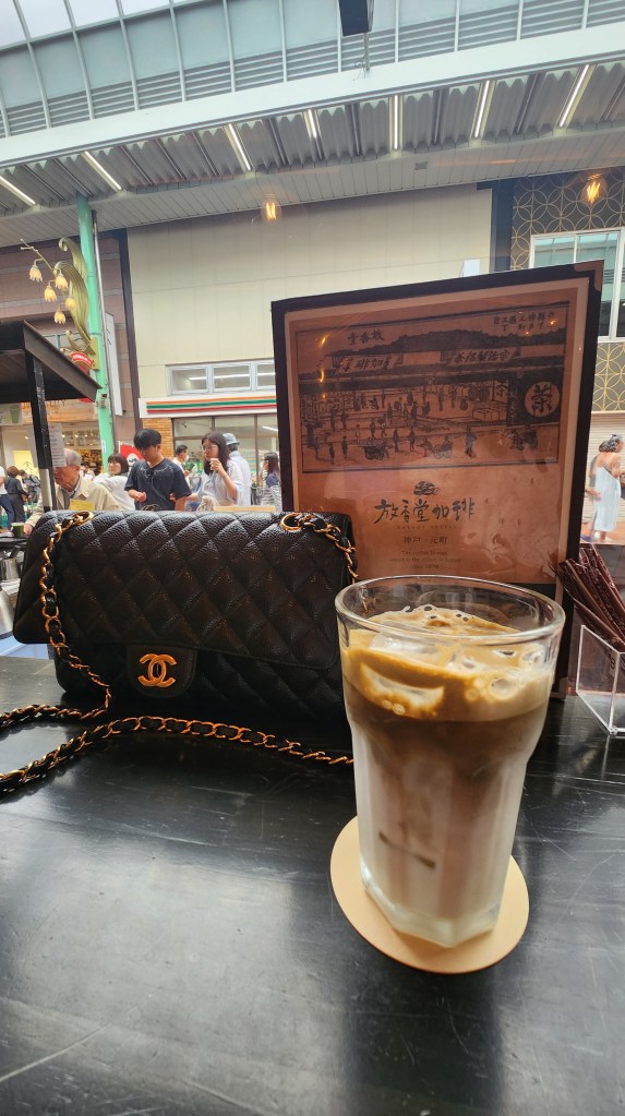 走到號稱日本最古老的咖啡店,放香堂咖啡店。一坐下整間店都是咖哩的味道,非常的香。咖喱飯在外面已經被標示賣完了,而且我們剛吃完麻辣豆腐,難道還想要再吃嗎?我點了烘培茶拿鐵,朋友點了漂浮冰咖啡,坐在窗邊的吧台看著商店街的人來人往。