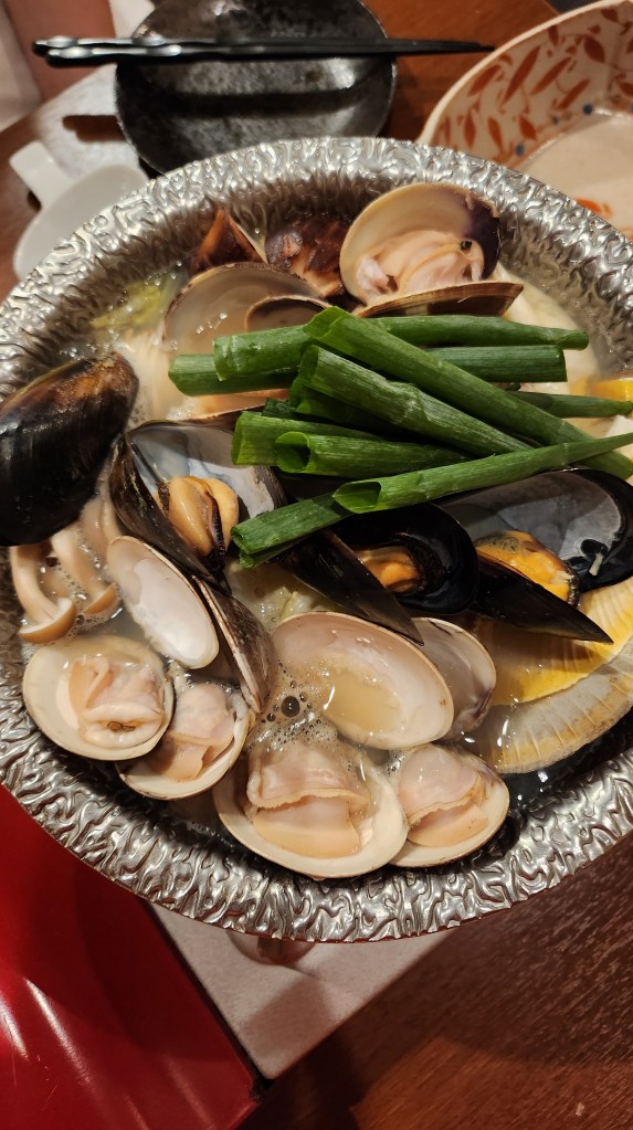 我們是唯一的一組客人。點了三種貝類下酒菜,酒蒸蛤蠣跟貝類小火鍋,點了酒之後他上了三種小菜,嗯,微妙。有手工豆腐、一個蕃茄味的東西跟榨菜,老實說我只想吃一點貝類所以才來這裡的,實在是沒有肚子可以再吃其他東西。